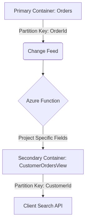 By using the Change Feed to populate a second container partitioned by CustomerId, we ensure that the Dashboard queries are single-partition lookups. This significantly reduces latency and Request Unit (RU) consumption.